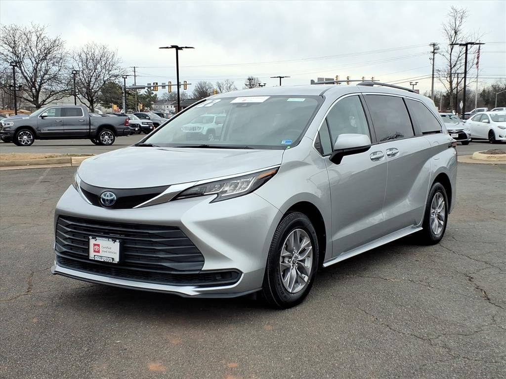 2022 Toyota Sienna LE — Certified Pre-Owned — Manassas, VA This 2022 Toyota Sienna LE combines efficiency, versatility, and peace of mind, now available in Manassas, VA with only 30,109 miles. Powered by a smooth 4-cylinder 2.5L Full Hybrid Electric (FHEV) powertrain and front-wheel drive, this Toyota Sienna delivers excellent fuel economy without sacrificing the space and comfort families need. The LE trim is thoughtfully equipped for modern daily driving. Stay connected with Hands-Free Bluetooth for calls and media streaming, and back up with confidence using the integrated Back-Up Camera. Advanced safety features include Cross-Traffic Alert to help detect approaching vehicles when reversing, enhancing situational awareness in busy parking areas. This vehicle also comes with a CARFAX Clean Report and is Certified Pre-Owned, providing added assurance through thorough inspection and certification standards. You'll appreciate the roomy interior, flexible seating configurations, and Toyota's reputation for reliability. Whether running errands around town or heading out on longer trips, this Toyota Sienna balances practicality with refined driving dynamics thanks to its hybrid system. Priced competitively, this vehicle represents the best price in the area for a certified, low-mileage Toyota Sienna with these features. Contact our Manassas showroom to schedule a test drive or request the CARFAX report and certification details.
