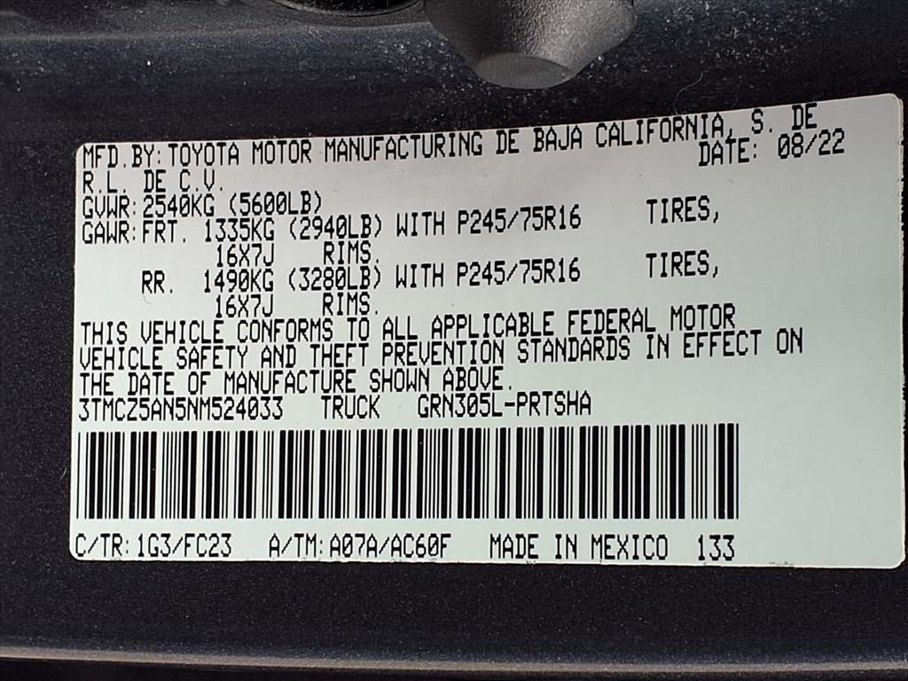 The Toyota Tacoma has a clean CARFAX vehicle history report. This unit features a hands-free Bluetooth phone system. This model offers Automatic Climate Control for personalized comfort. Good News! This certified CARFAX 1-owner vehicle has only had one owner before you. This Toyota Tacoma offers Android Auto for seamless smartphone integration. Apple CarPlay: Seamless smartphone integration for this vehicle - stay connected and entertained on the go! Protect the vehicle from unwanted accidents with a cutting edge backup camera system. This 2022 Toyota Tacoma is a manufacturer certified pre-owned vehicle. Make room for more passengers, carry extra luggage or your favorite sports gear with the roof rack on this small pickup. This 2022 Toyota Tacoma emanates grace with its stylish gray exterior. It has a V6, 3.5L high output engine. When you encounter slick or muddy roads, you can engage the four wheel drive on the Toyota Tacoma and drive with confidence.