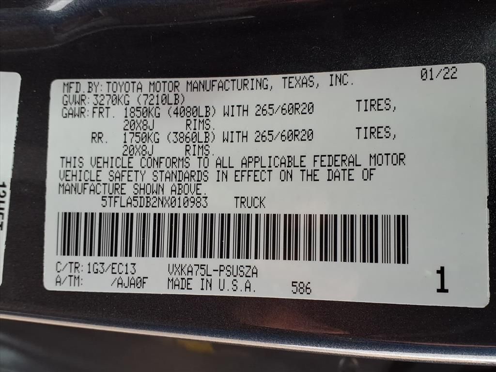 2022 Toyota Tundra SR5 — 4WD, V6 3.5L, 19,040 miles — Best Price in Manassas VA Looking for a rugged, reliable pickup with low mileage and exceptional value? This 2022 Toyota Tundra SR5 in Manassas VA is an outstanding choice. Powered by a V6 3.5L (3445 cc) gasoline engine and equipped with 4WD, this Toyota Tundra delivers confident performance for worksite days and weekend adventures. With just 19,040 miles, it offers the benefits of a nearly-new truck at a pre-owned price. Key features include Automatic Climate Control for year-round comfort, Hands Free Bluetooth connectivity, Apple CarPlay integration for seamless smartphone use, and a Blind Spot Monitor to enhance driving safety. The vehicle comes with a CARFAX Clean Report, providing transparency and peace of mind about its history. This Toyota Tundra SR5 combines durability, modern tech, and low ownership costs. Whether you tow, haul, or commute, the robust V6 engine and 4WD capability make it versatile for any task. Priced to move, it currently has the best price in the area—an excellent opportunity to secure a low-mileage Toyota Tundra without the new-truck premium. Contact us in Manassas VA to schedule a test drive and see why this 2022 Toyota Tundra SR5 is the smart, value-driven choice for your next truck.