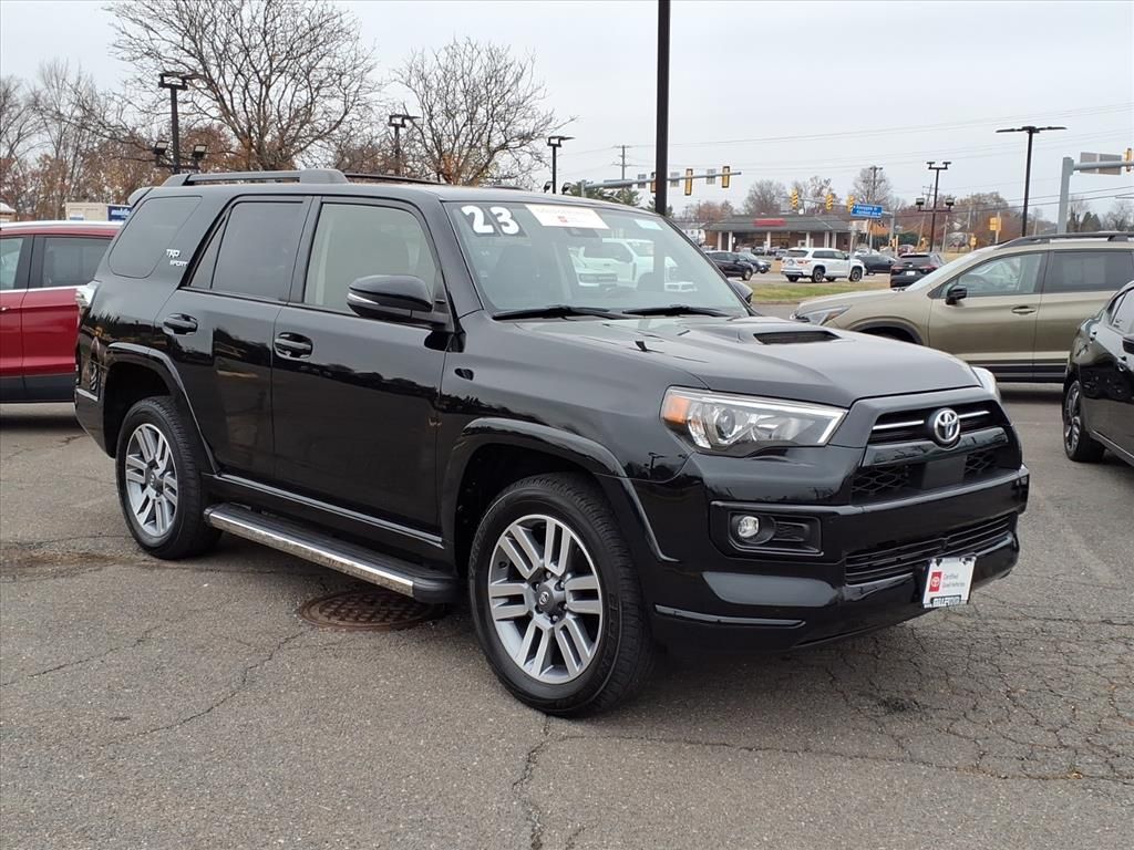 See what's behind you with the back up camera on this mid-size suv. This unit is a manufacturer certified pre-owned vehicle. The leather seats in it are a must for buyers looking for comfort, durability, and style. This 2023 Toyota 4Runner comes equipped with Android Auto for seamless smartphone integration on the road. Good News! This certified CARFAX 1-owner vehicle has only had one owner before you. It has a clean CARFAX vehicle history report. Bluetooth technology is built into it, keeping your hands on the steering wheel and your focus on the road. This model's blind spot monitor enhances safety. Apple CarPlay: Seamless smartphone integration for this Toyota 4Runner - stay connected and entertained on the go! This unit warns of approaching vehicles with Cross-Traffic Alert. This model has a V6, 4.0L high output engine. Conquer any rainy, snowy, or icy road conditions this winter with the all wheel drive system on this Toyota 4Runner.