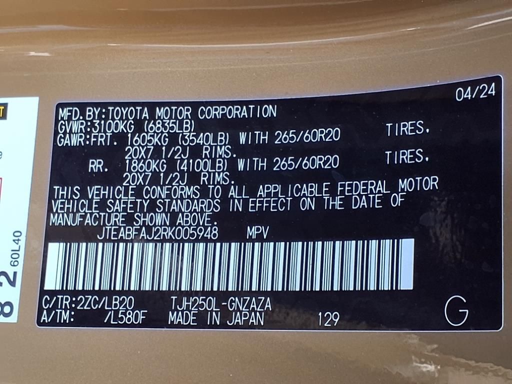 Land Cruiser Premium Package Includes 14-speaker JBL Premium Audio. Illuminated Entry. Digital Key Capability. Power Moonroof w/ Sunshade. Center Console Cool Box. Digital Rearview Mirror. Qi-Compatible Wireless Charging. Leather-Trimmed Memory/Power Driver's Seat. Head-Up Display (HUD). Lane Change Assist (LCA). Front Cross-Traffic Alert (FCTA). & Traffic Jam Assist (req. Drive Connect Trial/Subscription; 1yr Trial Incl.) 4G Network Dependent: Pre-Collision System; Sunroof and Moonroof; 14-Speaker JBL Premium Sound System; Interior Rear View Mirror; Side Step & Step Cover; Front Cross Traffic Alert; 8-Way Power Seats; Lane Keeping System; Leather Seat Trim; Head-Up Display (HUD); Blind Spot Monitor with Lane Change Assist; Entry Digital Key; Wireless Charger. Roof Rack. 20" X 7.5J Aluminum Wheels. Sunroof and Moonroof. Connected Services Trial Offering. Door Edge Guard. Wheel Locks. Smart USB Phone Cables. **Equipment listed is based on original vehicle build and subject to change. Please confirm the accuracy of the included equipment by calling the dealer prior to purchase.**